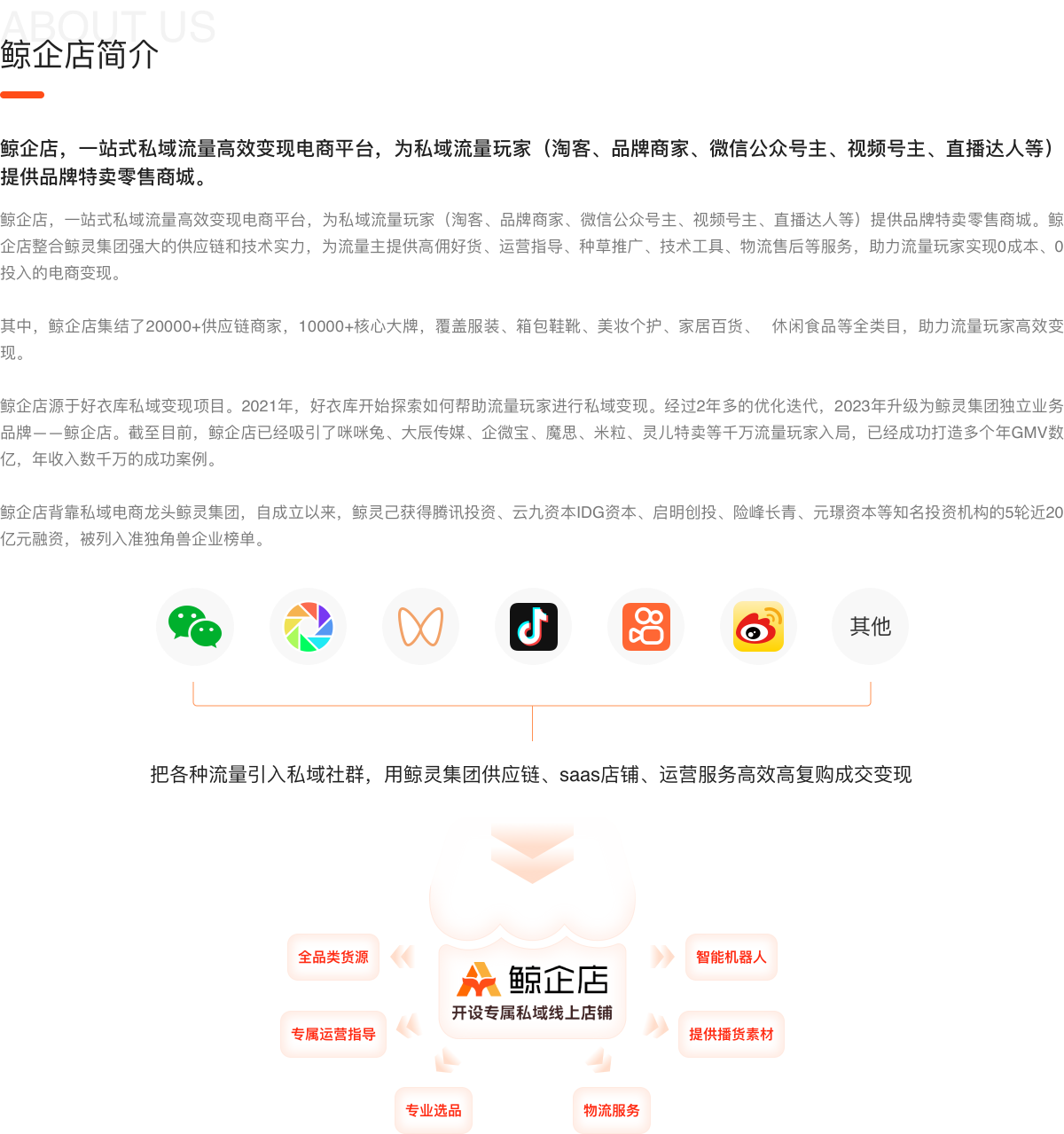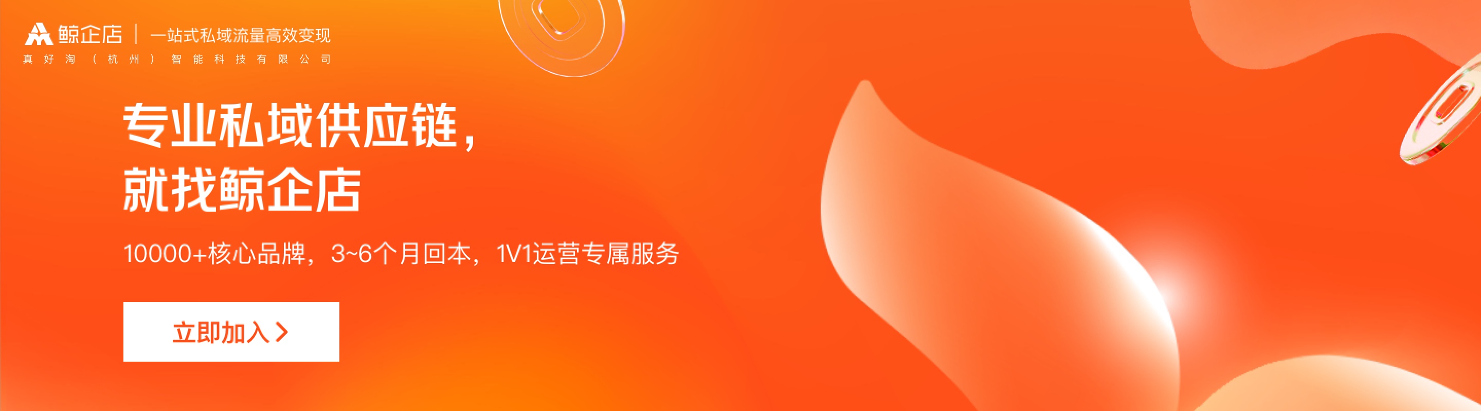 鲸企店,一站式私域流量高效变现电商平台,为私域流量玩家(淘客、品牌商家、微信公众号主、视频号主、直播达人等提供品牌特卖零售商城