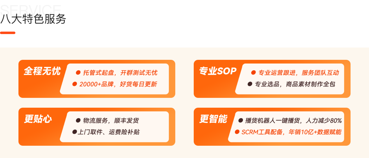 鲸企店 全品类货源 智能机器人 专属运营指导 提供播货素材 专业选品 物流服务