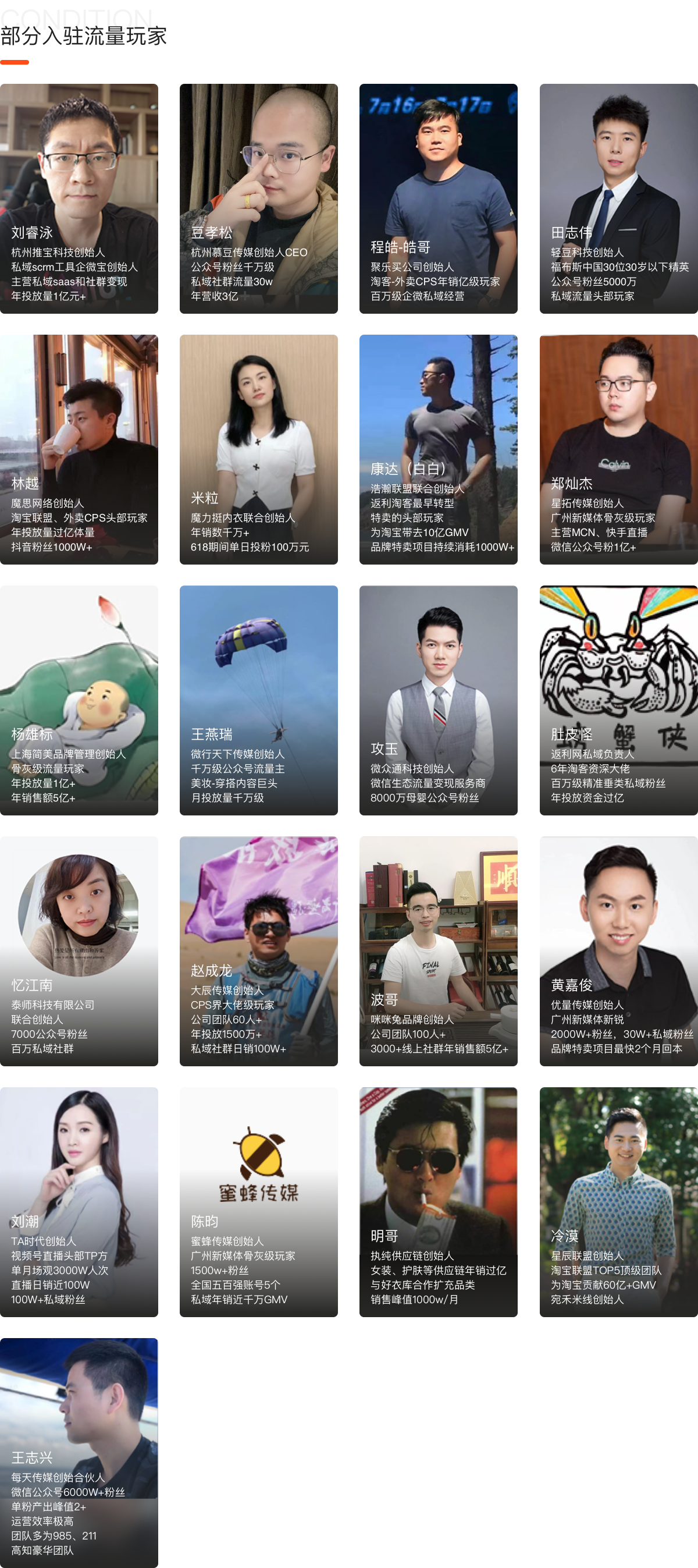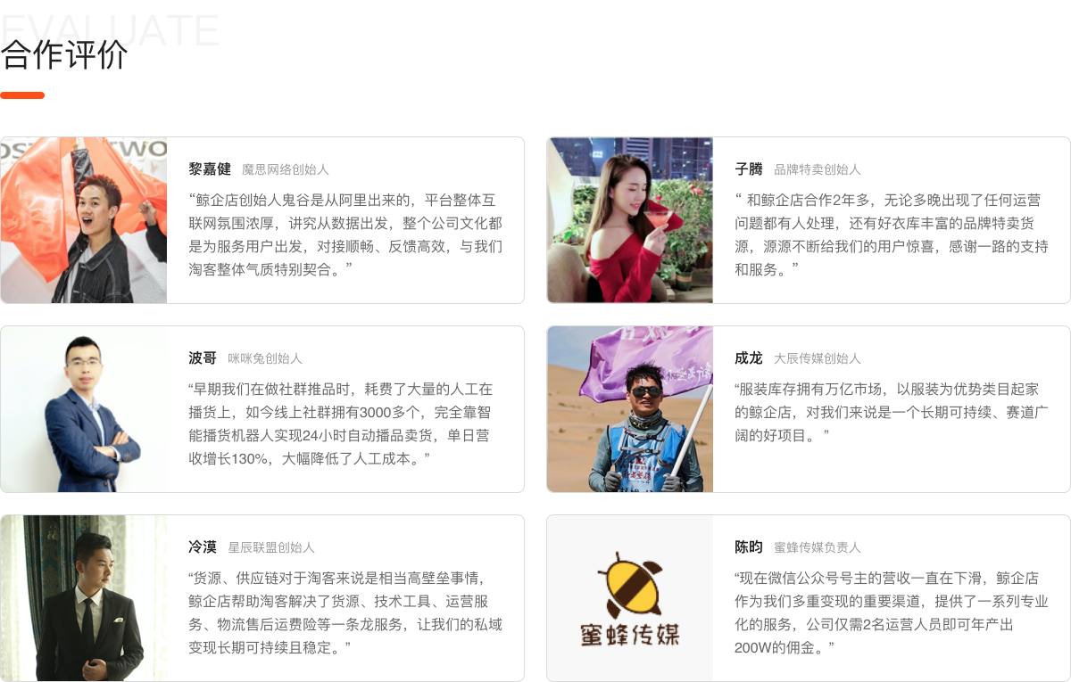 鲸企店源于好衣库私域变现项目。2021年,好衣库开始探索如何帮助流量玩家进行私域变现。经过2年多的优化迭代,2023年升级为鲸灵集团独立业务品牌一一鲸企店。载至目前,鲸企店已经吸引了咪咪兔、大辰传媒、企微宝、魔思、米拉、灵儿特卖等千万流量玩家入局,已经成功打造多个年GMV数亿,年收入数千万的成功案例。